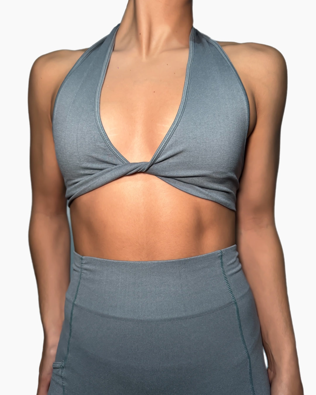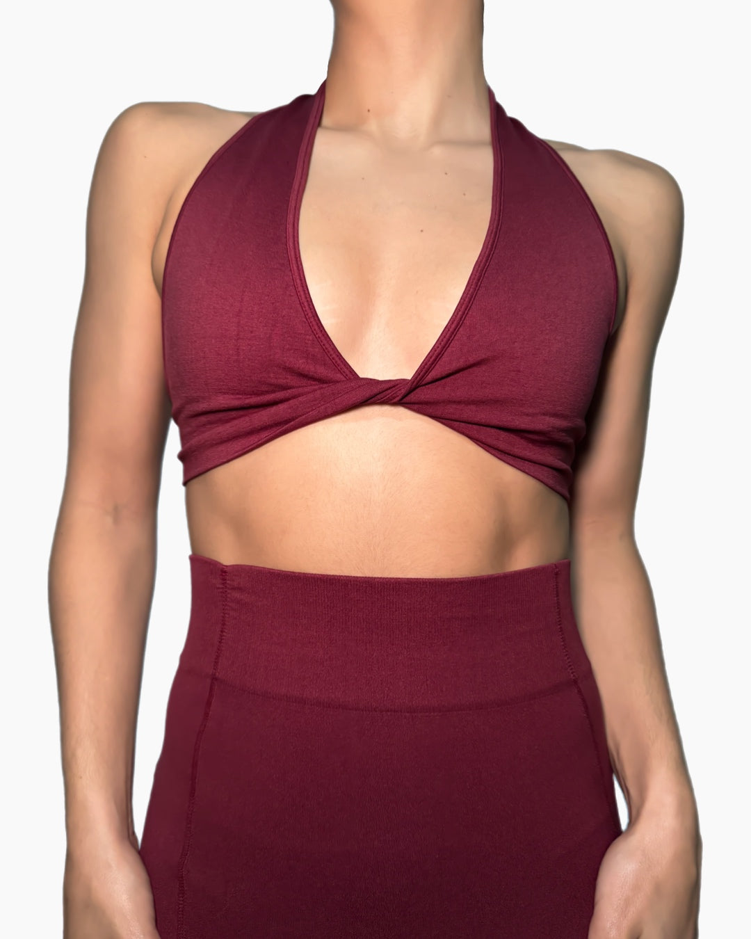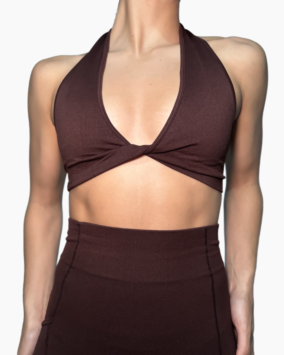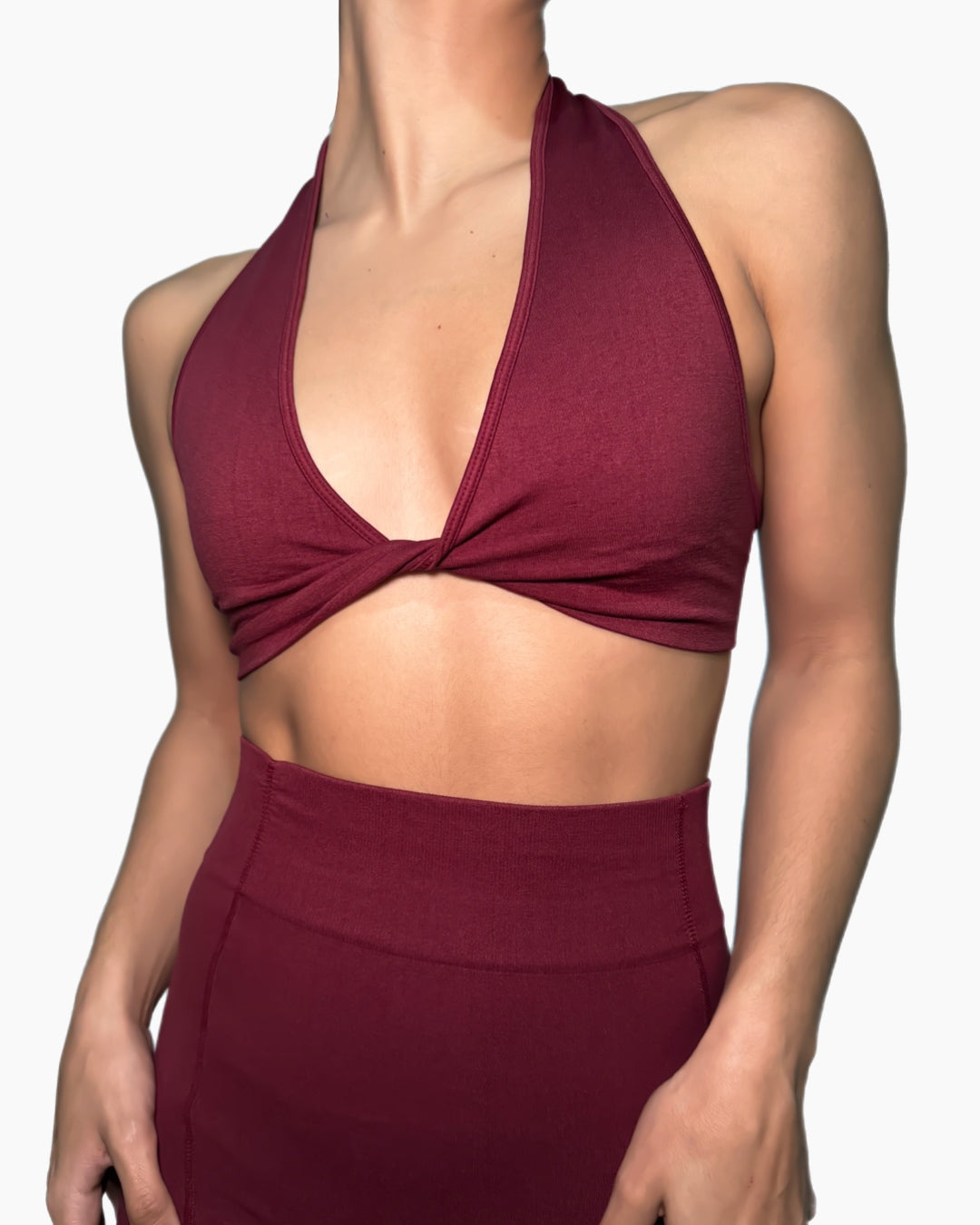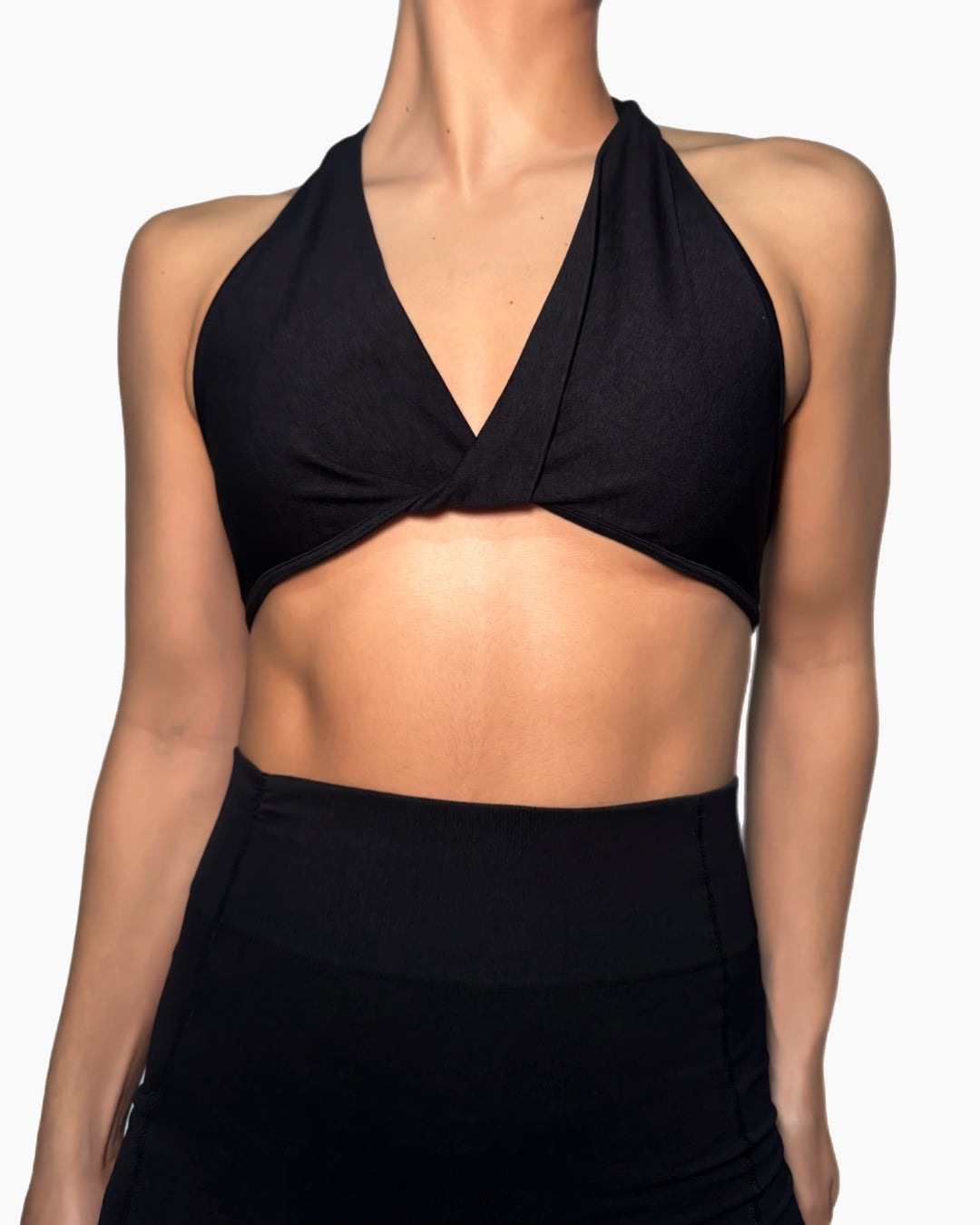 Top tipo halter con diseño twist frontal que realza la figura y resalta el cuello y los hombros. Su espalda descubierta transmite fuerza y feminidad, mientras la tela suave se ajusta al cuerpo con elegancia y soporte. Perfecto para entrenar, fluir o salir con estilo.