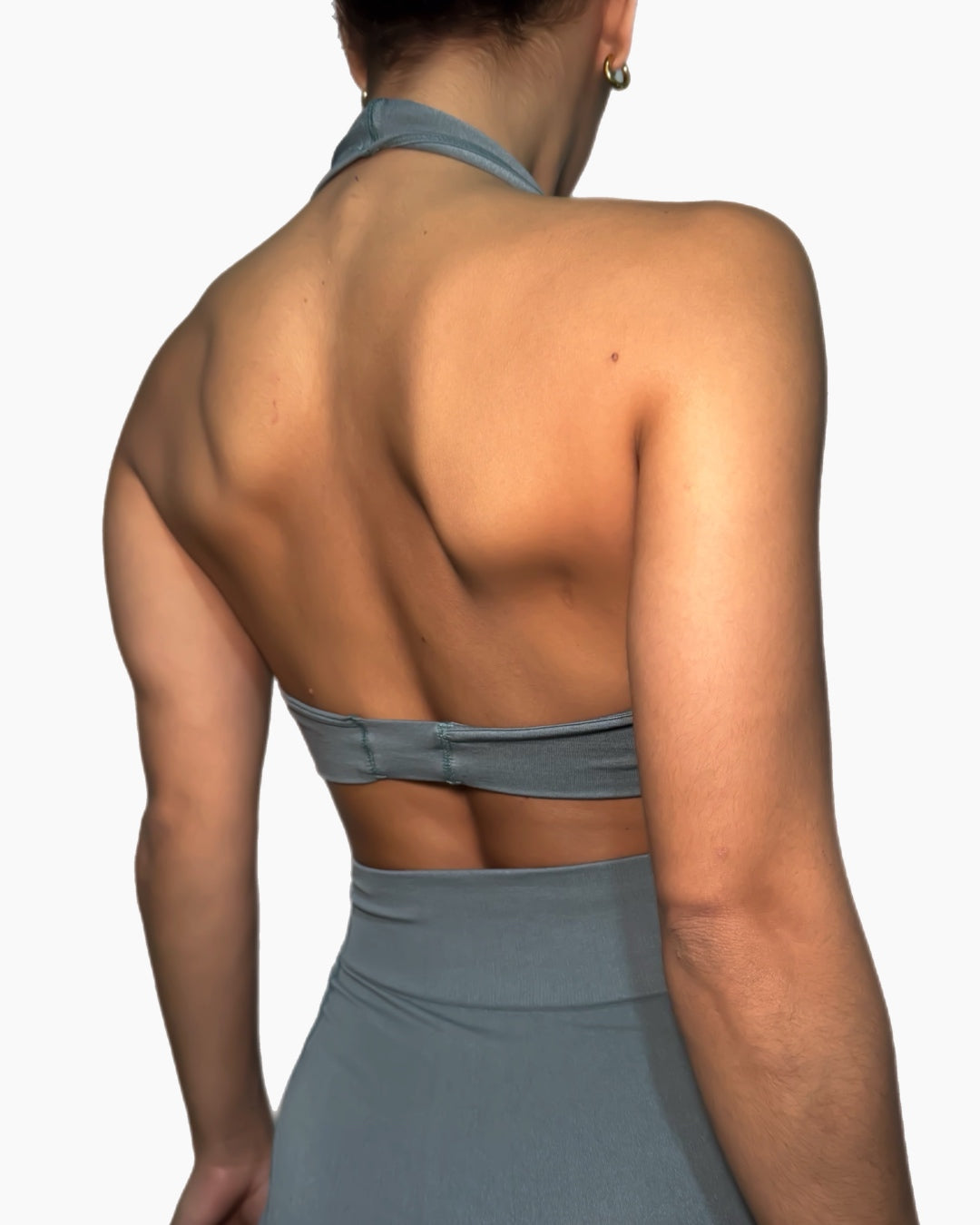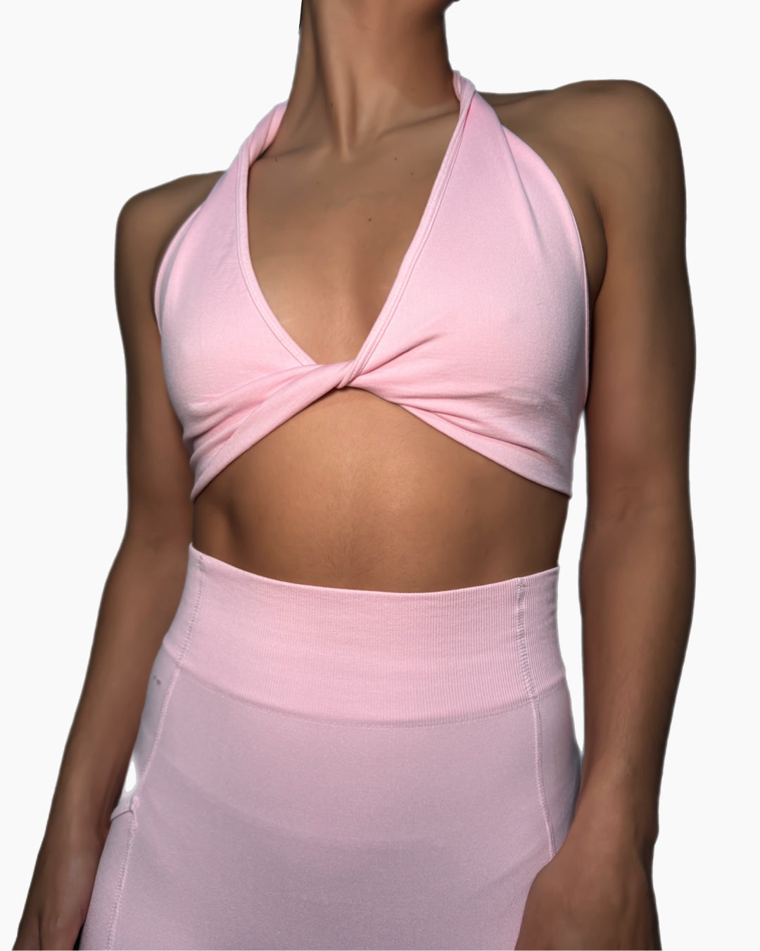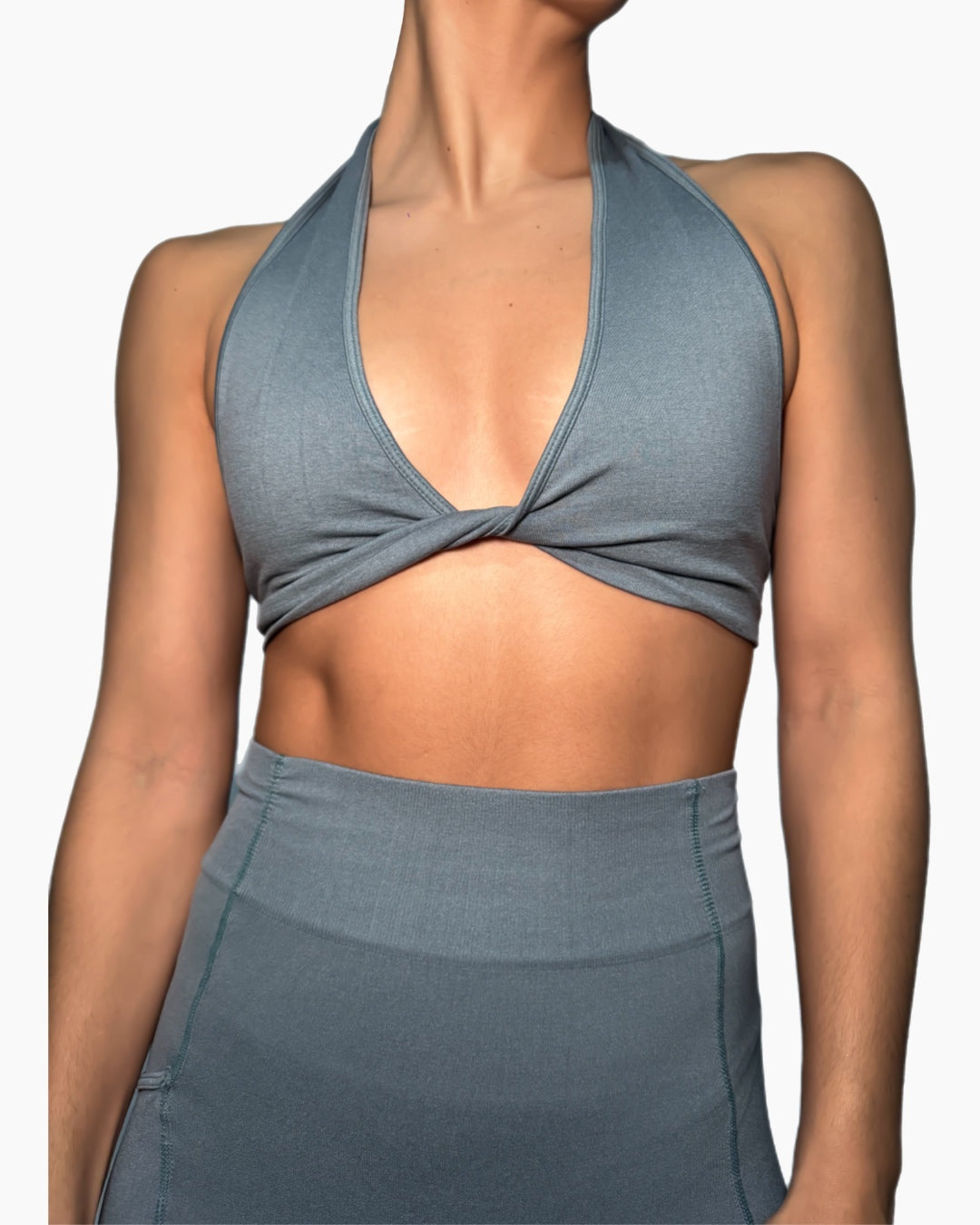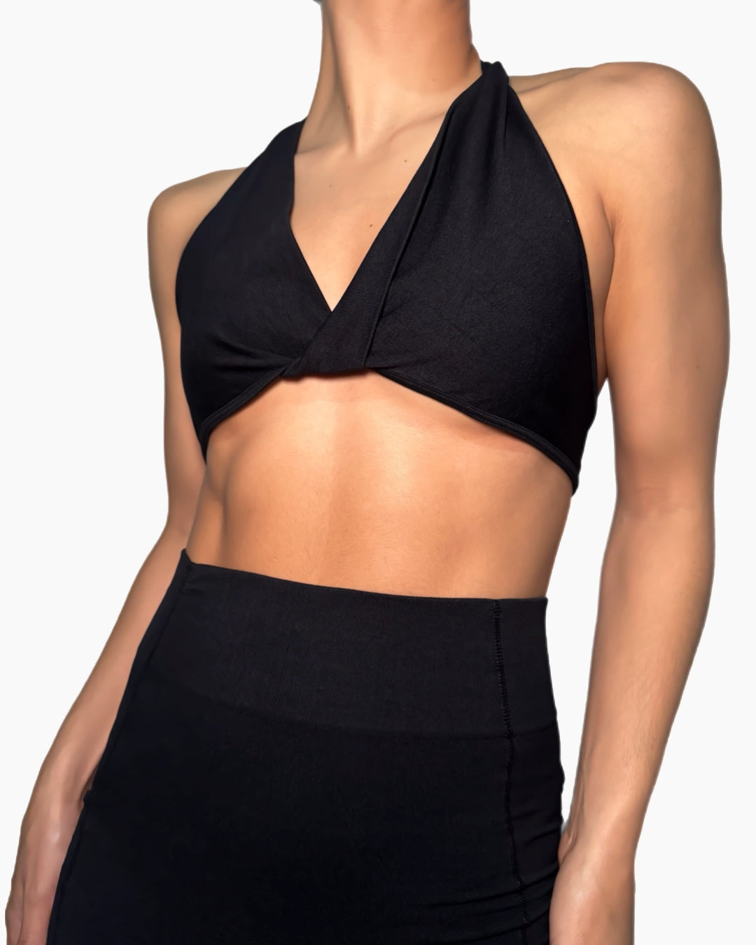 Top tipo halter con diseño twist frontal que realza la figura y resalta el cuello y los hombros. Su espalda descubierta transmite fuerza y feminidad, mientras la tela suave se ajusta al cuerpo con elegancia y soporte. Perfecto para entrenar, fluir o salir con estilo.
