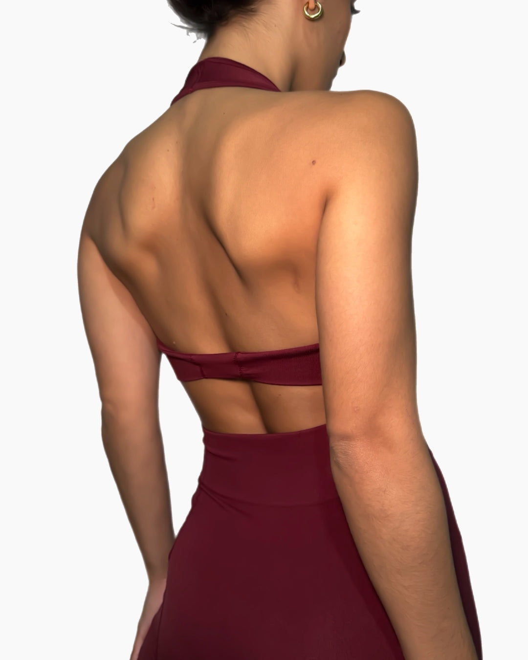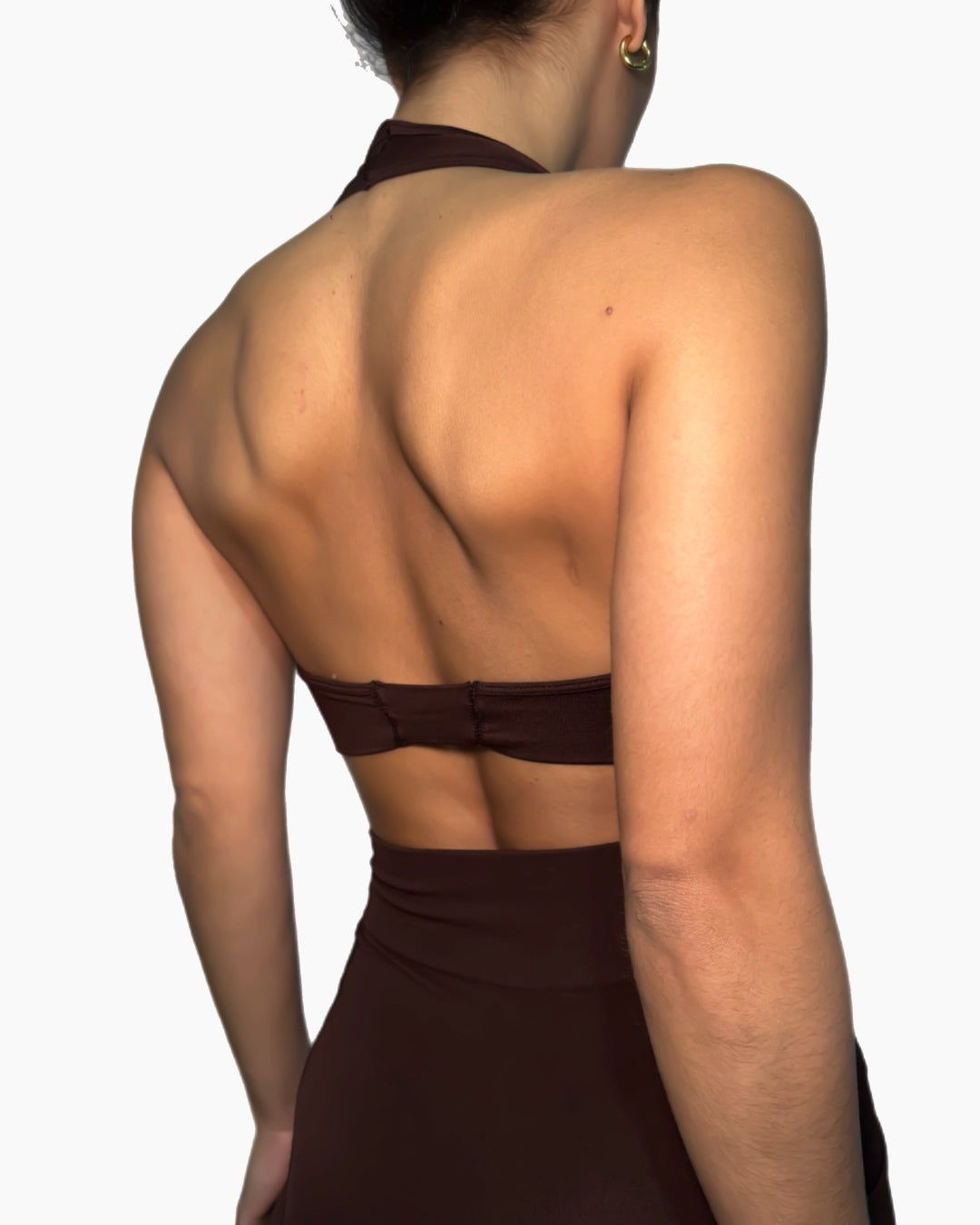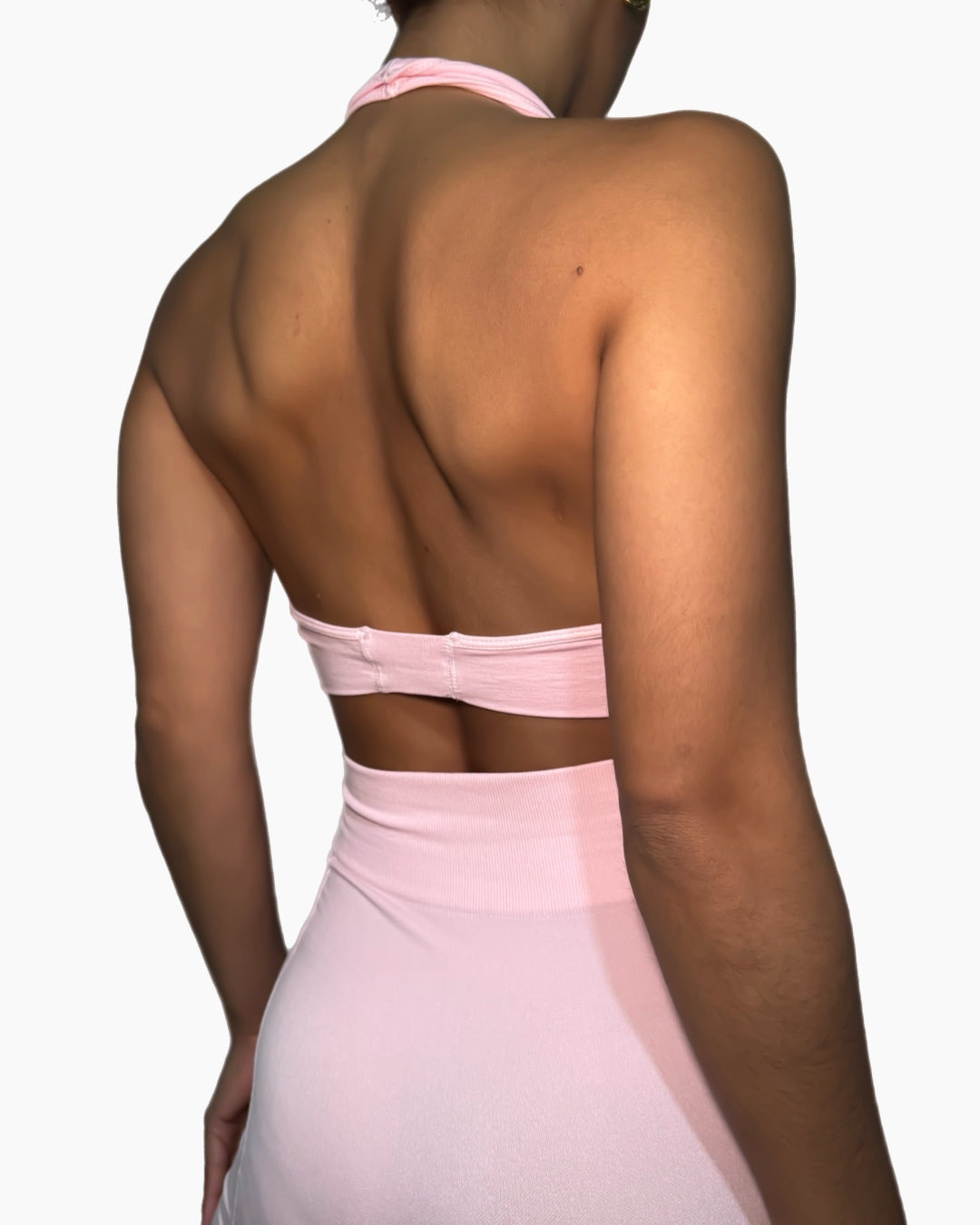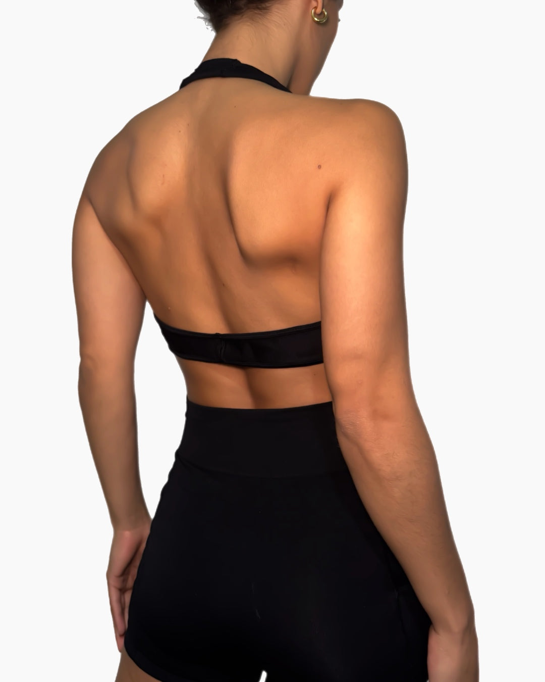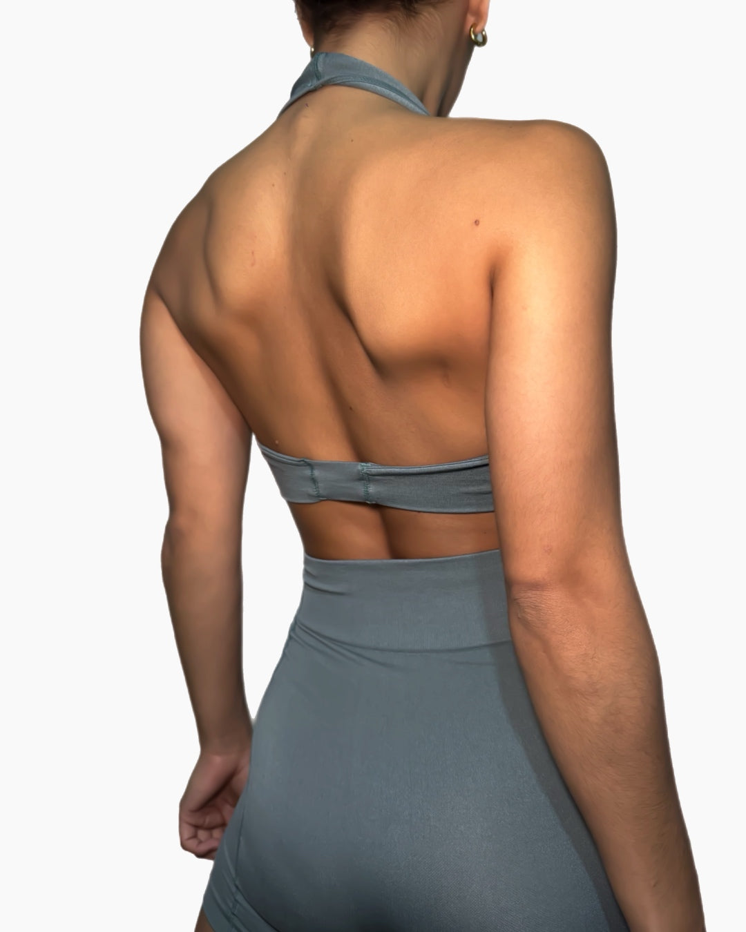 Top tipo halter con diseño twist frontal que realza la figura y resalta el cuello y los hombros. Su espalda descubierta transmite fuerza y feminidad, mientras la tela suave se ajusta al cuerpo con elegancia y soporte. Perfecto para entrenar, fluir o salir con estilo.