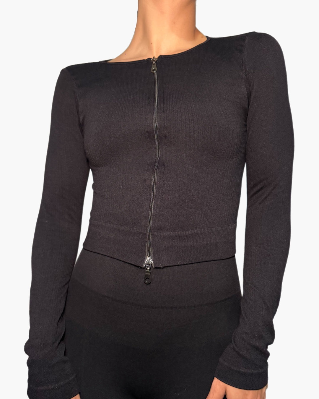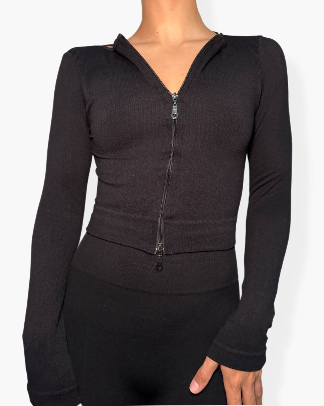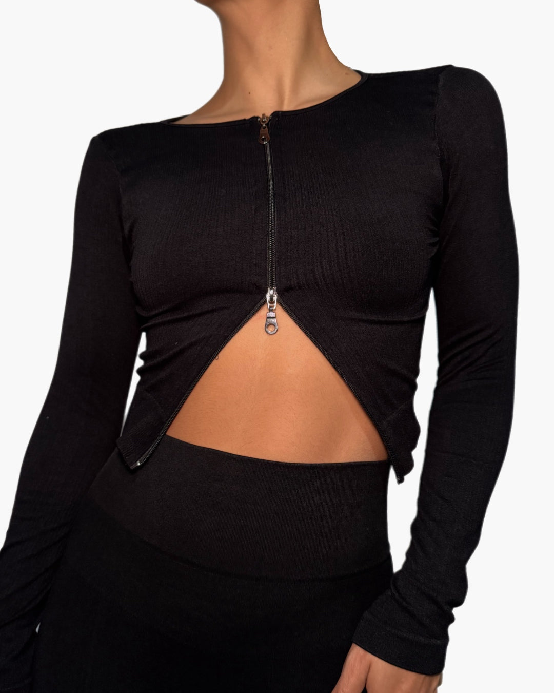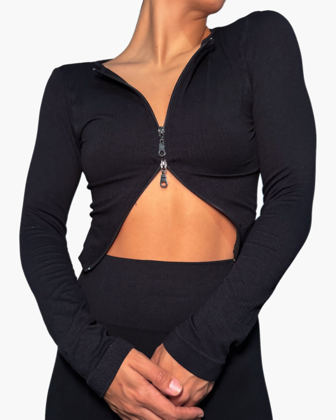 Top de manga larga con cierre frontal doble que permite ajustar la apertura según tu estilo o nivel de ventilación. Su tela elástica y ligera ofrece compresión media y total libertad de movimiento. Ideal para entrenamientos, uso casual o como complemento de cualquier conjunto deportivo.